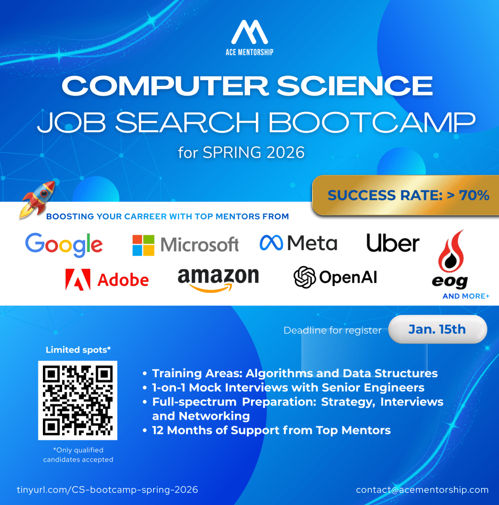 🎯 Năm 2025, Ace Mentorship mở Computer Science Job Search Bootcamp cho cohort mùa thu. Với sự bùng nổ của công nghệ cũng như sức hút của ngành CS, Bootcamp này sớm trở thành một trong các programs có lượng đăng ký cao nhất của team trong năm.