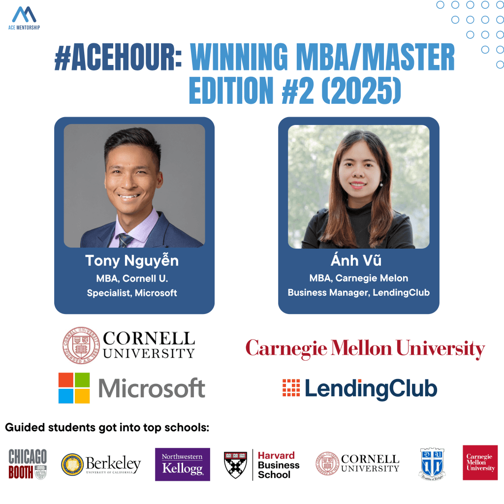 Q&A với Mentor Tony Nguyễn (Area Specialist của Microsoft, tốt nghiệp MBA Đại học Cornell ’25) và mentor Ánh Vũ (Business Manager tại Lendinglub, tốt nghiệp trường Carnegie Mellon ’24).